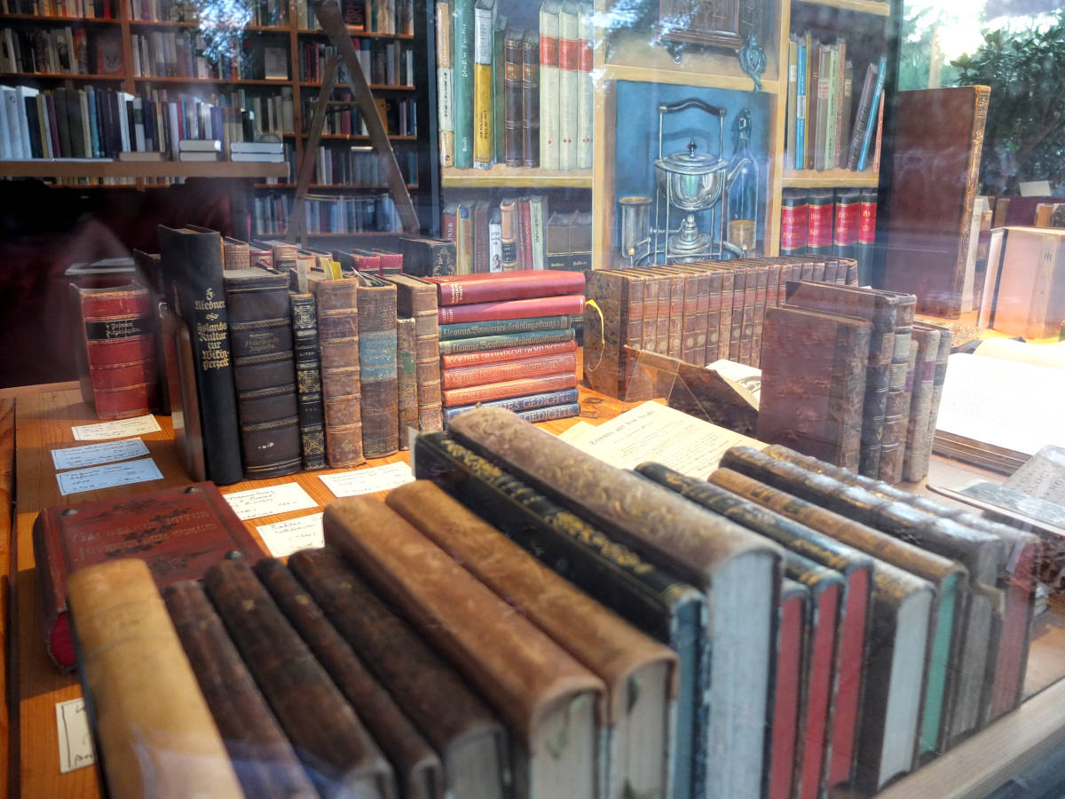 Sie betreten ein Antiquariat. Neben vielen aktuellen Büchern finden Sie ein Regal mit alten Bänden, z.T. sehr alten Werken.