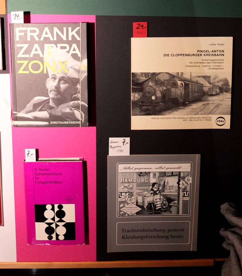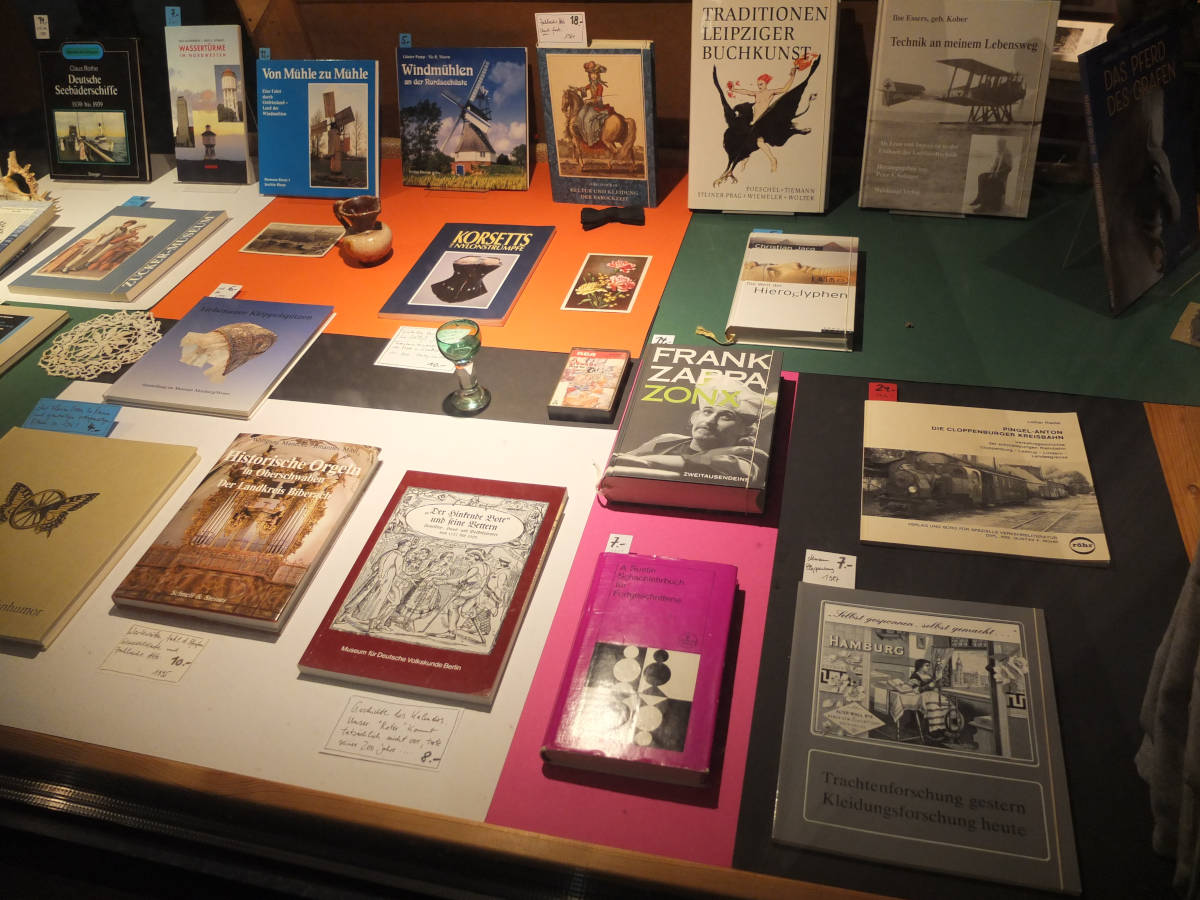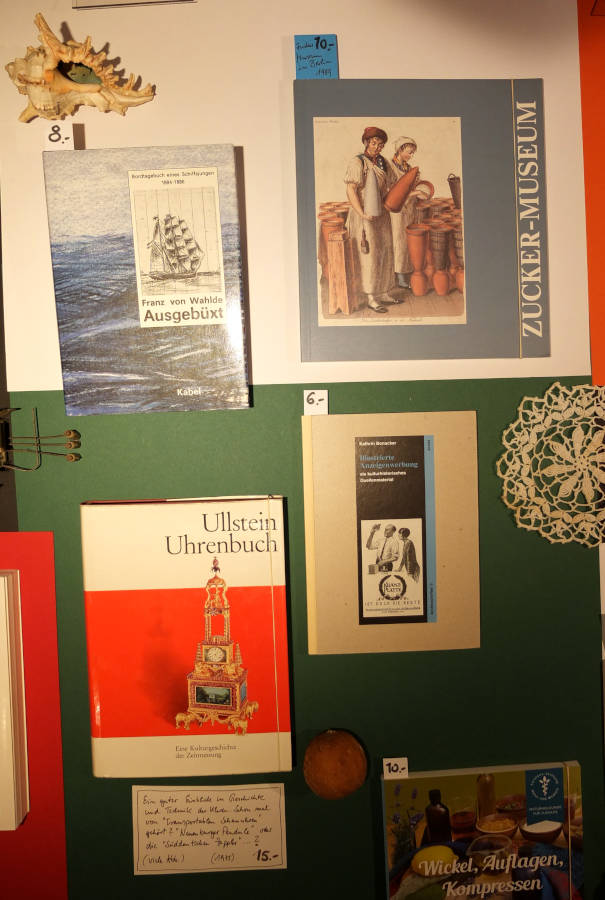 Dort gab es schätzungsweise 18 laufende Meter Regalboden über zahlreiche Themen. Für alle die Schach, Mühlengeschichte oder Stricken interessiert, mehr über die Geschichte des Zuckers und des Korsetts lernen möchten. Ferner gibt es im Laden Bücher zur Botanik, Seefahrt, Musik und Technik in übersichtlichen Mengen …